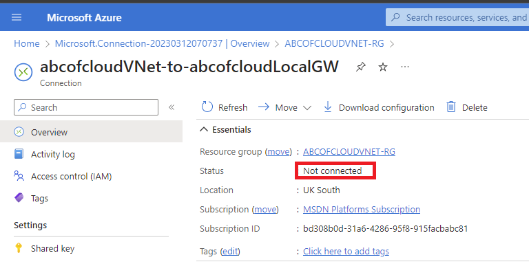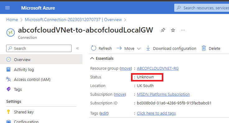 Now if I click on the connection that has been created, and take a look at the overview the status will be Unknown.
