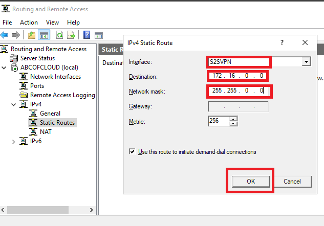 Step 1: On my Routing and Remote Access, open the drop-down menu on IPv4 and right-click on the Static Routes then click on New Static Route. On the IPv4 Static Route that pops up change the Interface to the Demand-dial that was created. The destination and Network mask should be the same as the one on the virtual network we created and then hit ok.